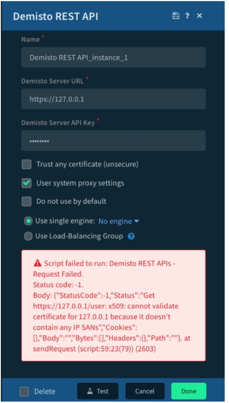 Given the exception thrown in the accompanying image by the Demisto REST API integration, which action would most likely solve the problem?