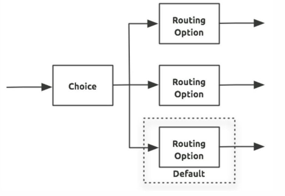 Only one of the routes in the Choice router executes, meaning that the first expression that evaluates totruetriggers that route's execution and the others are not checked. If none of the expressions aretrue, then the default route executes.