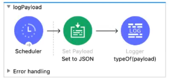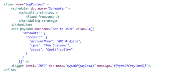 A JSON payload is set in the Set Payload transformer.