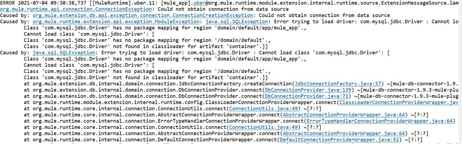 Class 'com.mysql.jdbc.Driver' has no package mapping for region 'domain/default/app/mule_app'.,