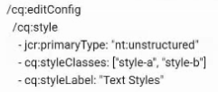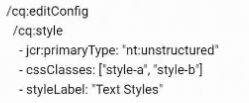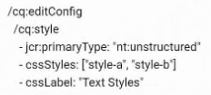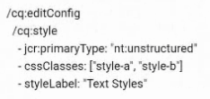 A developer needs to configure two style options (style-a and style-b) for a text component so authors can choose between different pre-defined styles for their content. What is the correct way to define the cq:editConfig node?