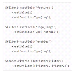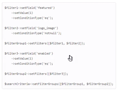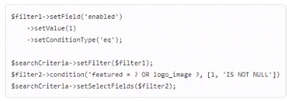 An Adobe Commerce developer is working on a module to manage custom brand entities and wants to replicate the following SQL query using SearchCriteria: