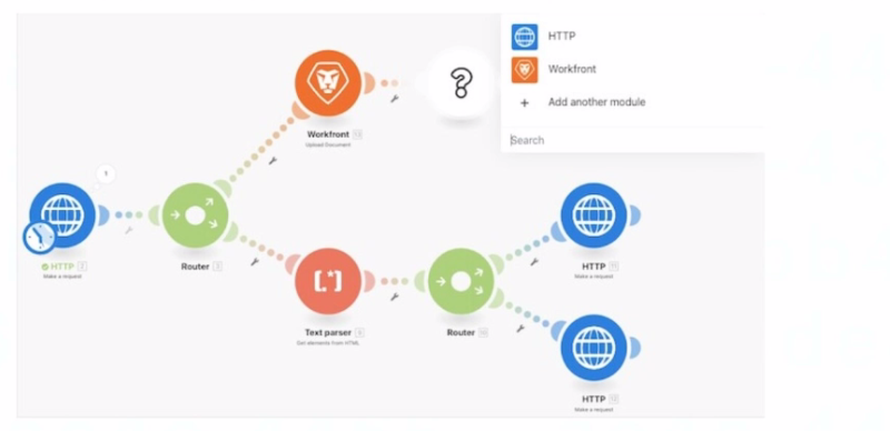 The goal is to reuse multiple fields from the Workfront module (e.g., data extracted or processed earlier in the flow) as mapped expressions in HTTP PUT requests located in the bottom paths.