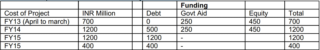 3. The power project is of 600 megawatts (MW) shall comprise 4 units of 150 MW each. The estimated cost of project is about INR3, 500 Million to be spent over a period of 4 year(s) the project is estimated to be commercially operational by April 1, 2016 with two units operational on same day and one unit each will be operational on April 1, 2017 and April 1, 2018.