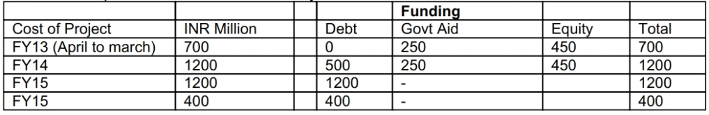 3. The power project is of 600 megawatts (MW) shall comprise 4 units of 150 MW each. The estimated cost of project is about INR3, 500 Million to be spent over a period of 4 year(s) the project is estimated to be commercially operational by April 1, 2016 with two units operational om same day and one unit each will be operational on April 1, 2017 and April 1, 2018.
