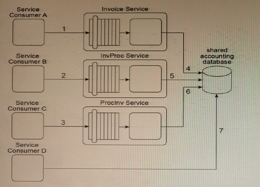 Additionally, Service Consumer D was designed to access invoice data from the shared accounting database directly (7). (Within the context of this architecture, Service Consumer D is labeled as a service consumer because it is accessing a resource that is related to the illustrated service architectures.)