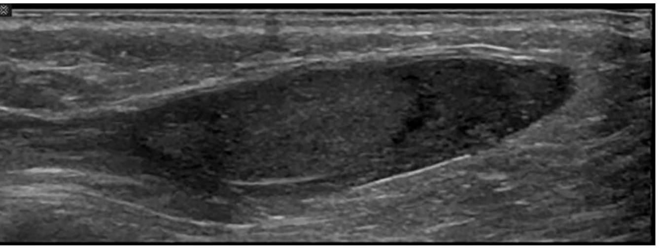 The ultrasound image shows an ovoid, homogeneously hypoechoic soft tissue structure located in the inguinal canal, surrounded by echogenic fat and soft tissue. This is consistent with an undescended testis, also known as cryptorchidism.