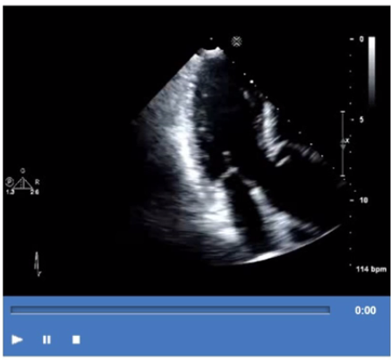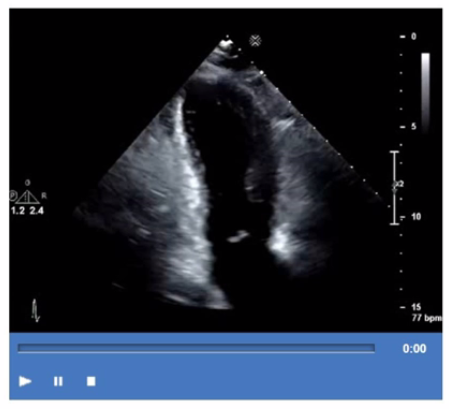 The video shows a parasternal long-axis view of the left ventricle and mitral valve with the anterior leaflet of the mitral valve moving abnormally toward the interventricular septum during systole. This systolic anterior motion (SAM) of the mitral valve is characteristic of hypertrophic obstructive cardiomyopathy (HOCM) and contributes to left ventricular outflow tract obstruction.