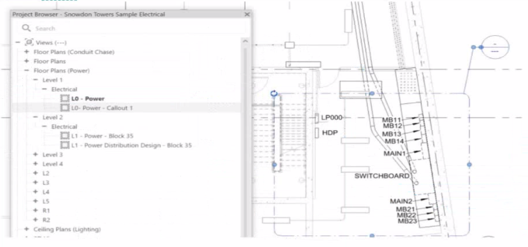 This means that when the designer selects the callout (in this case, shown as ''L0 - Power - Callout 1'' in the Project Browser), they can modify the Reference Other View setting from the Properties palette to point to a different, pre-existing detail view or callout view---for example, one showing an enlarged power distribution layout or switchboard detail.