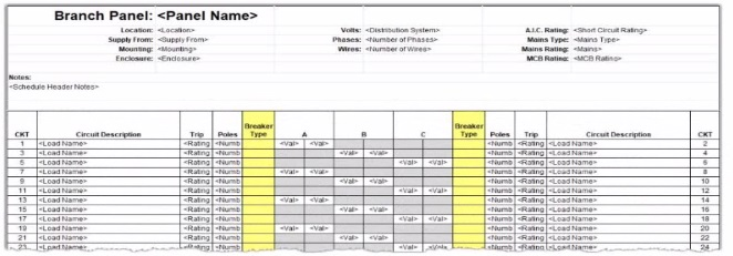 ''Panel schedules display parameters that are associated with electrical circuits, including load names, rating, poles, and breaker information. To include additional circuit information in a panel schedule, create a Project Parameter assigned to the Electrical Circuits category.''