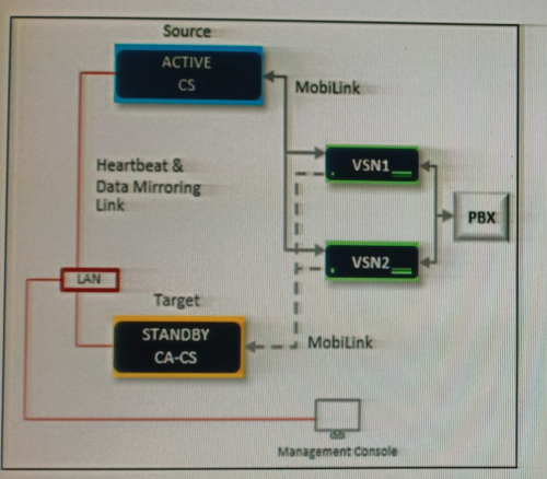 The exhibit depicts a High Availability (HA) configuration with two consolidated servers operating in an active-active mode. This setup ensures that both servers are actively handling workloads and can immediately take over the full operation if one server fails. The presence of a Heartbeat & Data Mirroring Link indicates that the servers are synchronized, providing real-time data replication and failover capabilities.