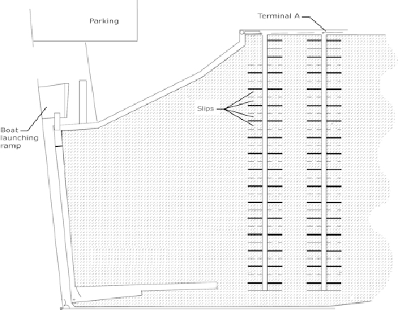 In this future marina layout, what would be the pre-cabling guideline to follow for the terminal A?
