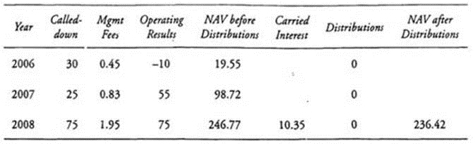 In years 2009 and beyond, the 20% carried interest is applied to the change in NAV before distributions. For example, if the 2009 NAV before distributions was 296.77, then the carried interest would equal (296.77 - 246.77) x 0.2 = 50 x 0.2 = 10.