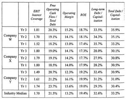 Michael Thomas, CFA, is a fixed-income portfolio manager for TFC Investments. As part of his portfolio strategy for the Prosperity Fund, Thomas searches for companies that he expects to be upgraded or downgraded. Those potential upgrades he finds are added to the portfolio or if already in the portfolio are increased in proportion to other holdings before the upgrade takes place. Potential downgrades are sold from the portfolio before the downgrade takes place. Thomas is evaluating his portfolio's current holdings which include several bonds issued by companies in the oil and gas exploration and refining industries. Year-end rating updates are expected to occur in a few days and Thomas is preparing to adjust his portfolio based on expected changes in credit ratings. He has assembled the following annual data on four of the oil and gas stocks in the portfolio: