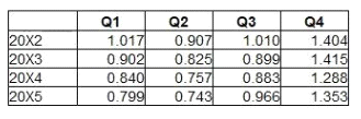 A business analyst has configured a trend regression for the sales of company X. The following table reports the ratios between the actual quarterly sales of company X and the calculated trend, for the period of four years.