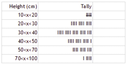A tomato producer is investigating the correlation between the height of his plants and the size of the tomatoes. He has tallied up his height results and produced this table.