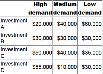 A company is considering four mutually exclusive projects. There are three possible future demand conditions but the company has no idea of the probability of each of these demand conditions occurring. The forecast net present values (NPVs) of each of the four projects, under each of the three possible future demand conditions, are as follows.