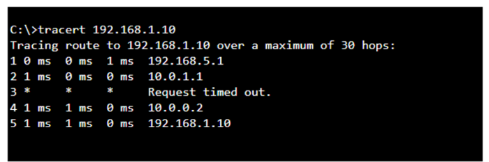 The tracert command output indicates that the server with the address 192.168.1.10 is reachable over the network. The asterisk (*) at hop 3 suggests that the probe sent to that hop did not return a response, which could be due to a variety of reasons such as a firewall blocking ICMP packets or the router at that hop being configured not to respond to ICMP requests. However, since the subsequent hops (4 and 5) are showing response times, it means that the packets are indeed getting through and the server is reachable12.