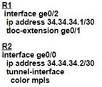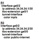 An MPLS connection on R2 must extend to R1 Users behind R1 must have dual connectivity for data traffic Which configuration provides R1 control connectivity over the MPLS connection?