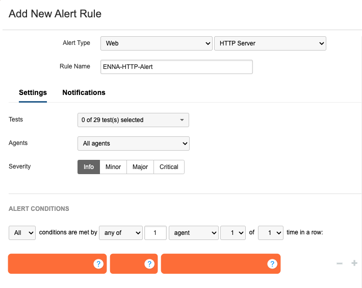 A network engineer is tasked with configuring an alert that will trigger if the HTTP server responds with a server error. What alert conditions should be configured to meet the specified requirements?