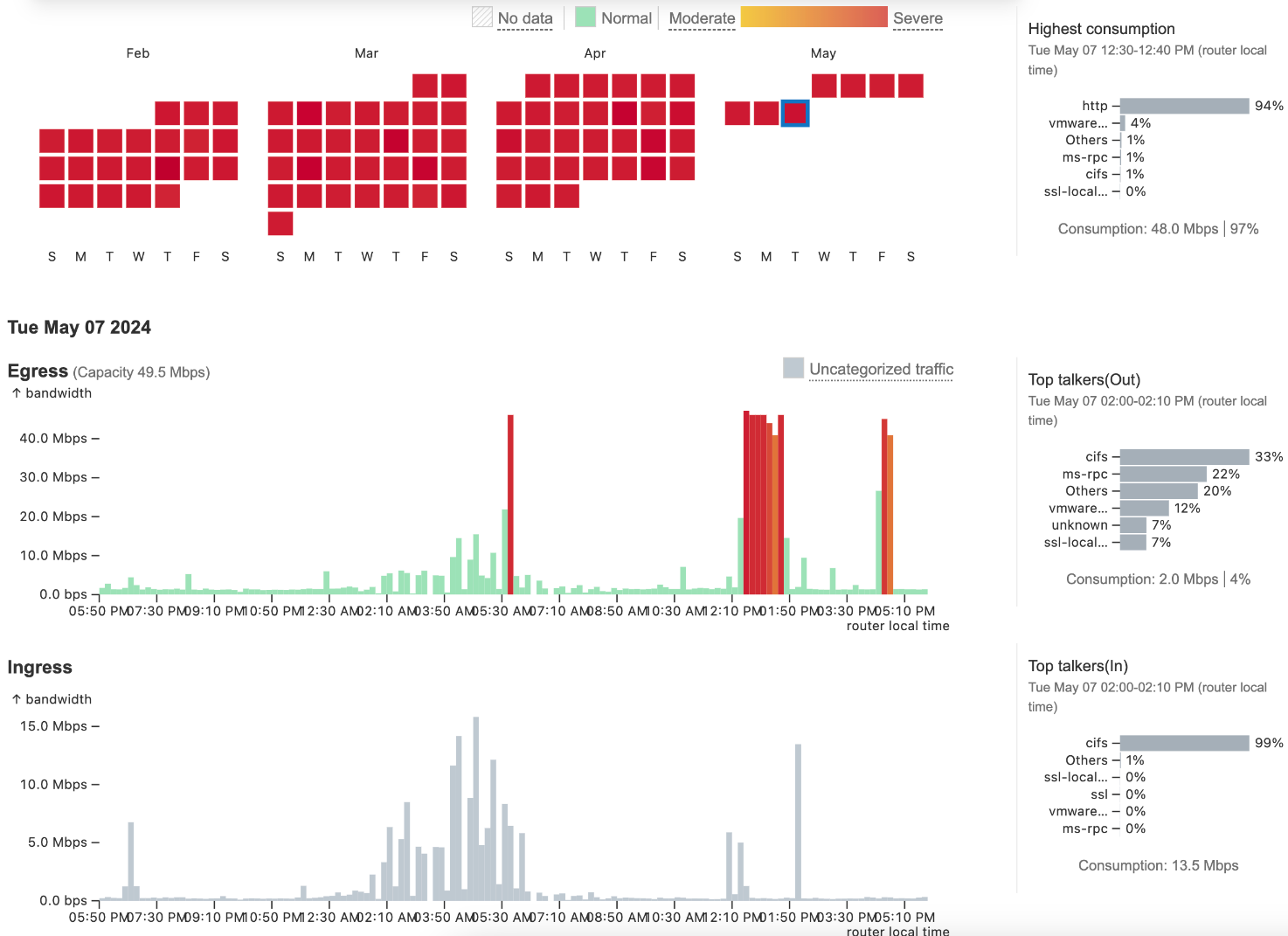 The exhibit displays a capacity planning dashboard with a calendar heatmap and traffic graphs. The heatmap for February through May shows a high frequency of 'Severe' (red) utilization blocks. Looking at the Egress graph for Tue May 07 2024, the traffic spikes clearly exceed 40.0 Mbps. Crucially, the dashboard indicates an 'Egress Capacity' of 49.5 Mbps and reports that the 'Highest consumption' was 48.0 Mbps, representing 97% of the available bandwidth.