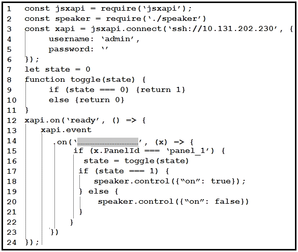 An 'Action Button' with identifier 'panel_1' is deployed to the Touch10 interface of a Room Series device. Which event must be inserted into line 14 to turn the music on/off in the conference room?