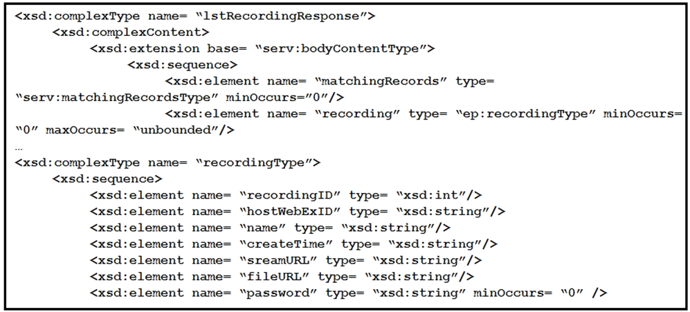 A snippet from the XSD schema of the Webex Meeting XML API 'LstRecordingResponse' element is listed in the exhibit. Assuming that a variable named 'resp' exists that contains the XML response from a successful 'LstRecording' request, which code snippet correctly generates a simple report that lists meeting names and recording file download links?
