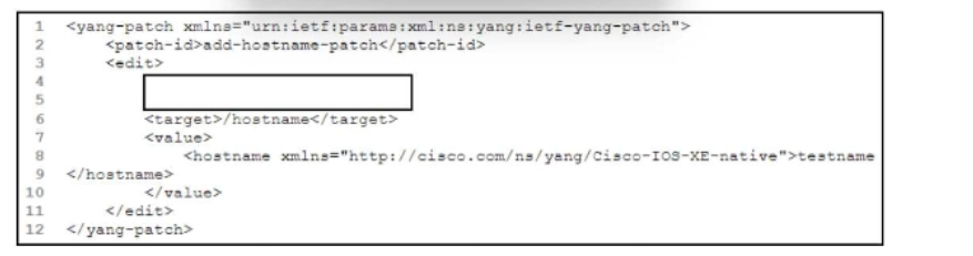 Refer to the exhibit. An engineer must add a new hostname configuration to a Cisco IOS device by using RESTCONF to make a YANG patch request. Which code snippet completes the configuration?