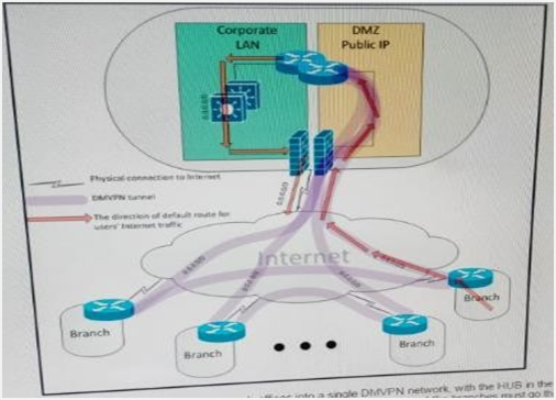 A customer interconnected hundreds of branch offices into a single DMVPN network, with the HUB in the main data center. Due to security policies, the customer requires that the default route for all Internet traffic from the users at the branches must go through the tunnel and the only connections that are allowed to and from the branch router over the local internet circuit are the DMVPN tunnels. Which two combined actions must you take on the branch router to address these security requirements and keep the solution scalable? (Choose two)