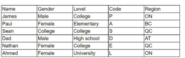 The table provided shows an inconsistency in the 'Gender' column, which lists three distinct values: Male, Female, and College. This is inconsistent because 'College' is not a gender category. The 'Gender' column should only have two distinct values, typically 'Male' and 'Female', to accurately represent gender data. This error could be due to a data entry mistake or a misclassification during data collection.