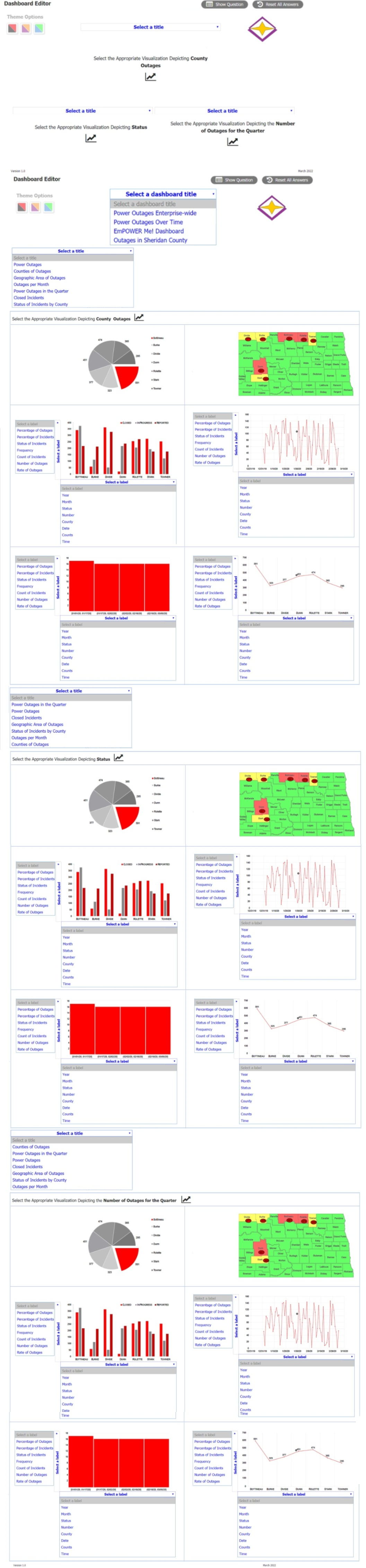 Select appropriate titles and labels for each visualization. Titles and labels may be used more than once. For example, you can use ''County Outages'' as the title for the map, ''Status'' as the title for the pie chart, and ''Trend'' as the title for the line graph. You can also use ''County'', ''Number of Outages'', ''Active'', ''Restored'', ''Pending'', ''Time'', and ''Number of Outages'' as labels for the axes and legends of the visualizations.