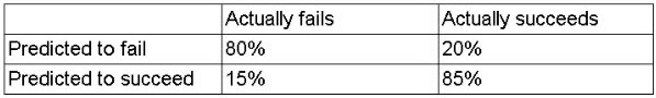 Treat each ''predicted-to-fail'' and ''predicted-to-succeed'' row as coming from 100 cases apiece (200 total).