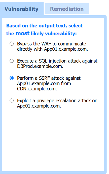 Most likely vulnerability: Perform a SSRF attack against App01.example.com from CDN.example.com.