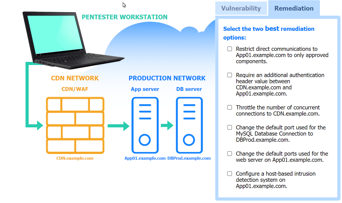 The scenario suggests that the CDN network (with a WAF) can be used to perform a Server-Side Request Forgery (SSRF) attack. Since the penetration tester has the pentester workstation interacting through the CDN/WAF and the production network is behind it, the most plausible attack vector is to exploit SSRF to interact with the internal services like App01.example.com.