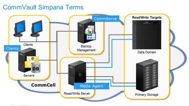 The first Simpana system installed must be configured as a CommServe. A CommServe defines a backup domain called a CommCell that manages member Clients, Media Agents, and data protection storage resources. The CommServe contains a SQL database that keeps track of the various agents and data protection metadata, such as the media index.