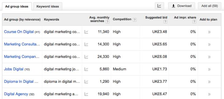 What is displayed in the Google AdWords screen below? Choose one of the following: