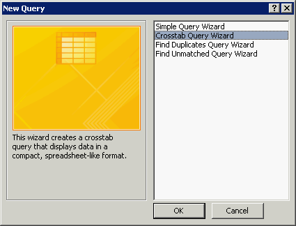 On the New Query dialog box, select the Crosstab Query Wizard, and click the OK button.