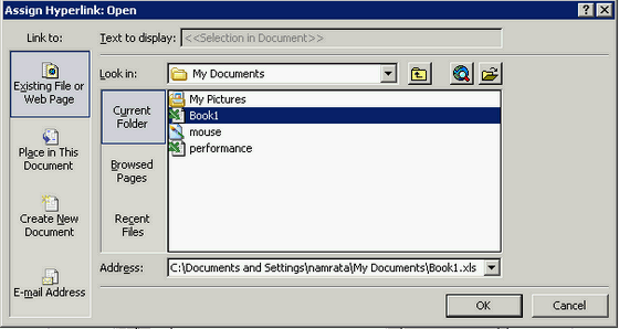 The Assign Hyperlink dialog box will appear. Use this dialog box to select the file or Web page to be linked to. A user can also type the file path or Web address in the Address box.