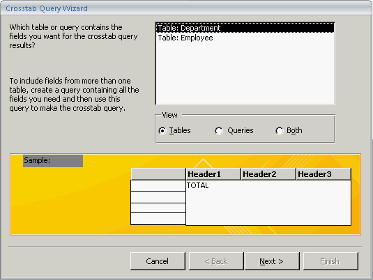 On the Crosstab Query Wizard, select a table, and click the Next button.
