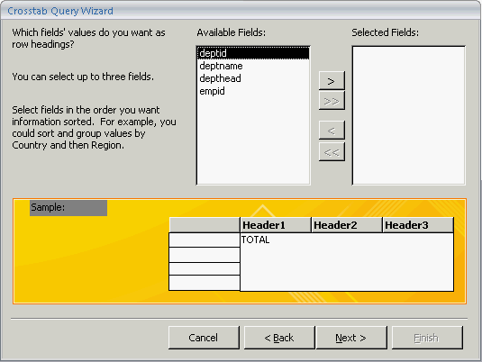 On the Crosstab Query Wizard, move the columns from the Available Fields list to the Selected Fields list by clicking on the > button. The >> button is not available in this wizard.