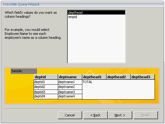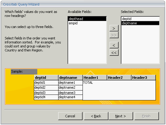 On the Crosstab Query Wizard, the columns of the selected table are displayed in the Available Fields list box.