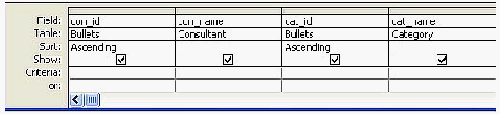 The QBE grid contains the names of the fields involved in the query and the criteria used to select records. In the QBE grid, each column consists of information about a single field from a query or table that is included in the upper pane. The image of the QBE grid is given below: