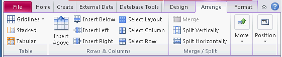 The Arrange contextual ribbon includes groups that can manage control groups, set text margins and padding for controls, toggle the Snap to the Grid layout feature, set tab order, align controls, and display Property Sheet.