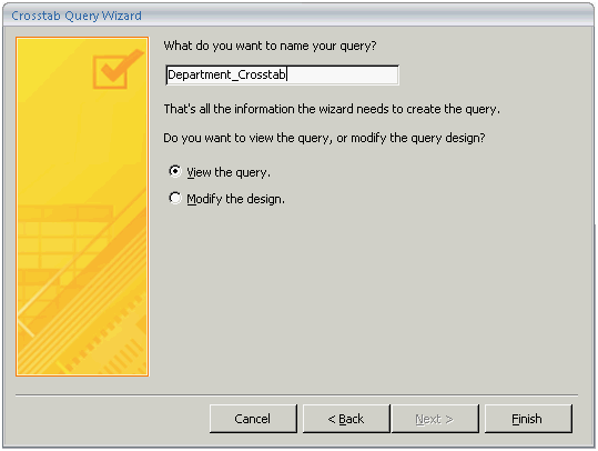 On the Crosstab Query Wizard, select the View the query radio button, and click the Finish button.