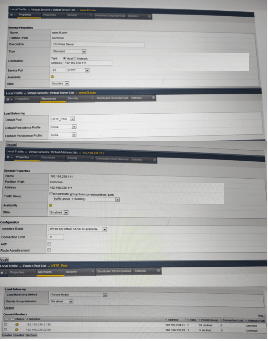 Virtual Address ARP Setting: In a standard BIG-IP deployment, the Address Resolution Protocol (ARP) must be enabled for the Virtual Address (192.168.238.111 in this case). When enabled, the BIG-IP system responds to ARP requests from the local network gateway or adjacent devices for that specific IP address.