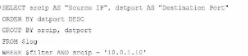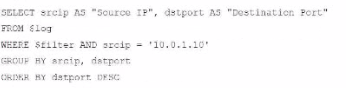 This option aligns perfectly with standard SQL syntax and filters correctly for srcip = '10.0.1.10', while ordering and grouping as required.