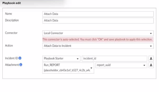 The field Attachment with a report_uuid placeholder suggests that the analyst is defining an output variable that will store the report data or ID, allowing it to be attached to the incident. This variable can then be referenced or passed within the playbook for further actions or reporting.