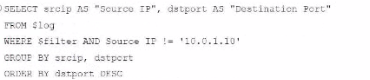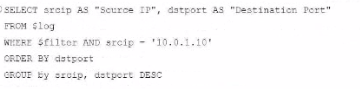 WHERE $filter AND srcip = '10.0.1.10': This line filters logs to only include entries with srcip equal to 10.0.1.10.