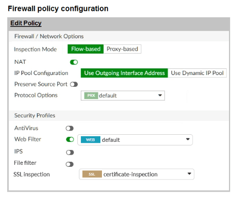 A web filter profile configuration and firewall policy configuration are shown.